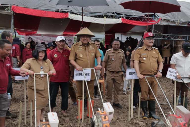 Pencanangan ditandai dengan penanaman bibit jagung oleh Gubernur Sulut Olly Dondokambey, bersama Penjabat Bupati Bolmong Limi Mokodompit, Sekda Tahlis Gallang dan Ketua DPRD Bolmong.(Kifli)
