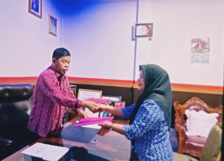 Kepala Dinas Pendidikan Kabupaten Minahasa Utara, Aldrien Posumah saat menyerahkan surat penunjukkan PLH kepada Kepsek SD Inpres Klabat baru Rasni Bone.(Foto:Istimewah).