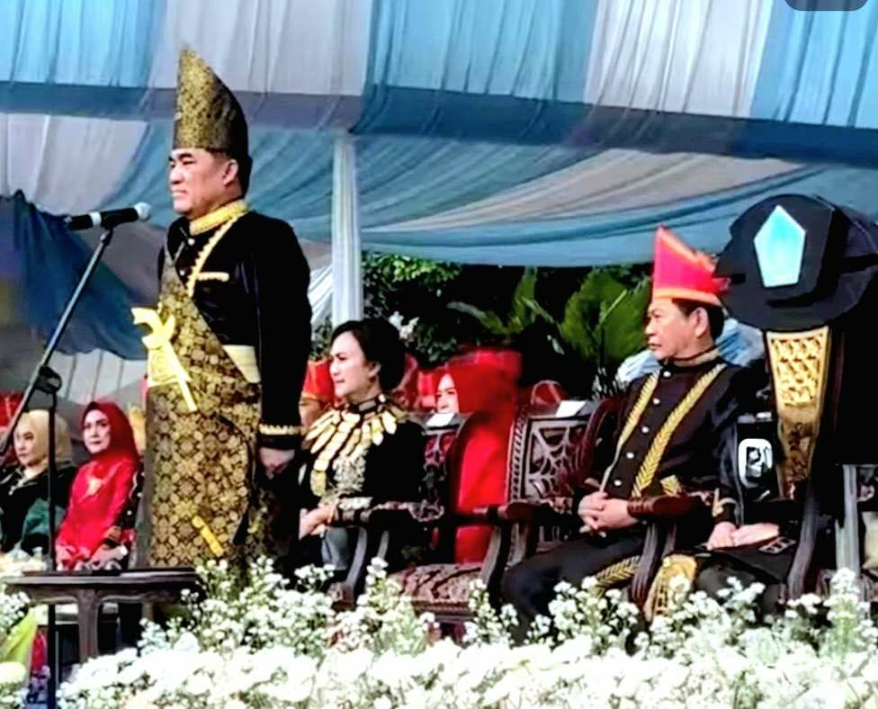 Gubernur Sulut Yulius Selvanus bersama istri mengenakan balutan pakaian adat daerah nyiur melambai bersama Wakil Gubernur Victor Mailangkay dan para undangan yang hadir.