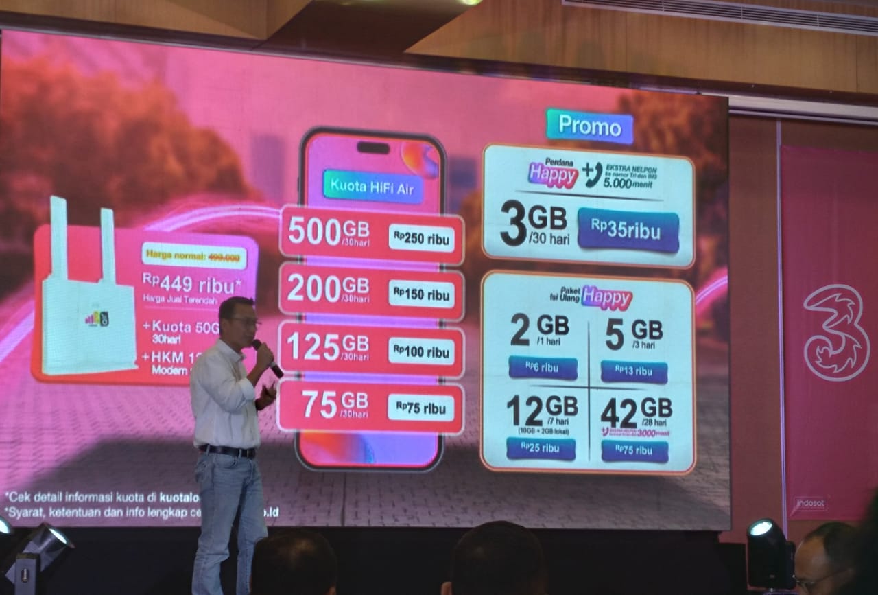 “Kami saat ini juga ada produk Tri dengan perdana happy 3 GB untuk 30 hari dengan hanya Rp 35.000 saja, 2 GB untuk 1 hari hanya Rp 6.000, 5 GB untuk 3 hari hanya Rp 13.000, 12 GB untuk 7 hari hanya Rp 25.000, 42 GB untuk 28 hari hanya Rp 75.000,”kata dia.