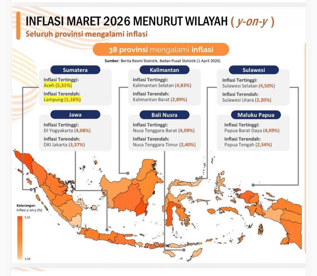 Secara nasional, kelompok makanan, minuman, dan tembakau memberikan andil terbesar pada inflasi Maret 2026, dengan komoditas utama seperti ikan segar, daging ayam ras, beras, telur ayam ras, dan cabai rawit. Namun, melalui langkah-langkah strategis Pemerintah Provinsi Sulawesi Utara dalam menjaga rantai pasok, tekanan pada komoditas pangan di daerah dapat diminimalisir.