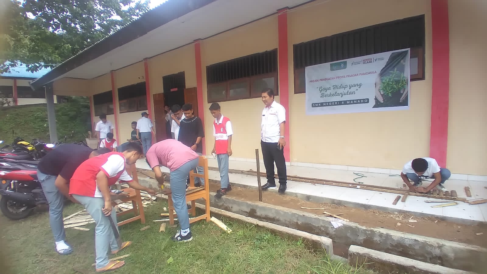 Program P5 ini diterapkan di SMK Negeri 8 Manado. Dalam pantauan di Sekolah, puluhan Siswa kelas 10 selang minggu ini atau selama 5 hari mulai Senin – Jumat melaksanakan kegiatan lingkungan dengan pembuatan taman Sekolah.